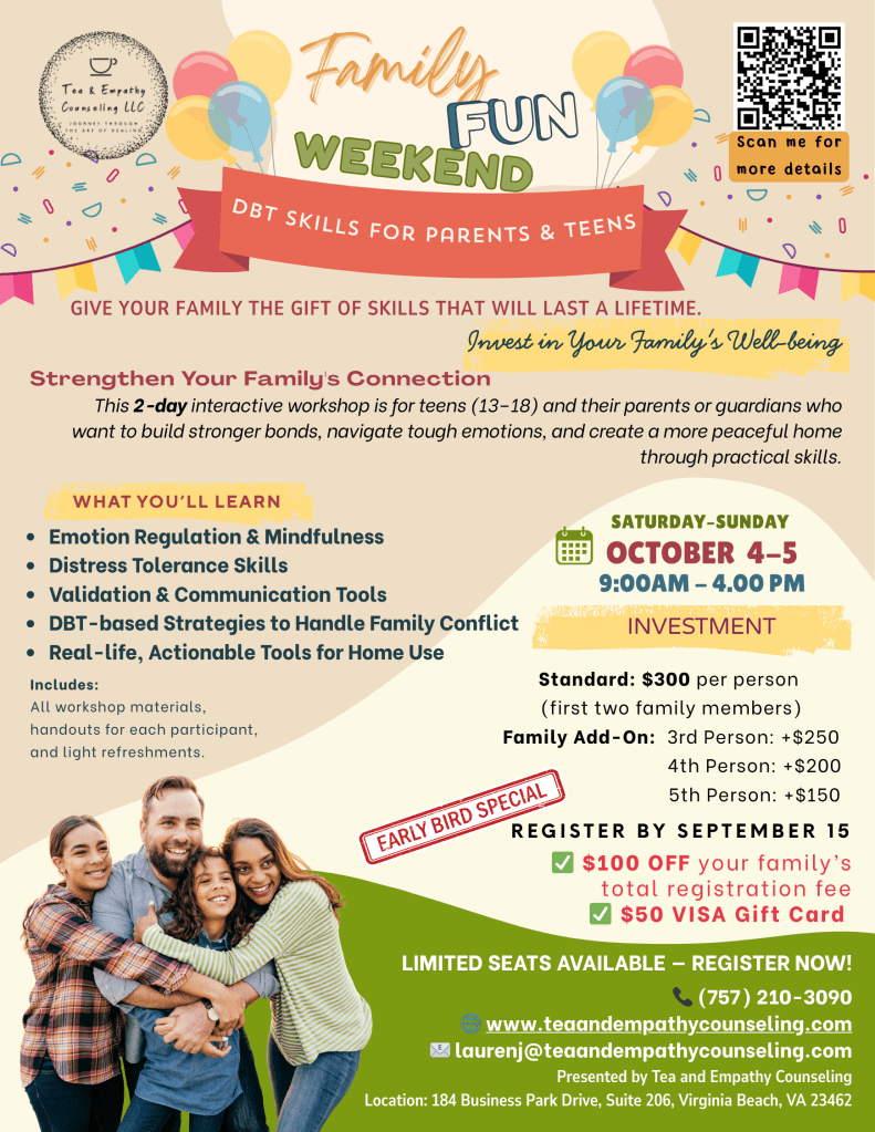 Day & Time Session Description Day 1: Foundations of DBT in the Family 9:00 AM – 10:30 AM Welcome & Introduction to DBT Create a safe space, learn core concepts like Wise Mind, and break the ice with family activities. 10:45 AM – 12:00 PM The Role of Emotions Understand why we have emotions and practice separating facts from interpretations in disagreements. 12:00 PM – 1:00 PM Lunch Break — 1:00 PM – 2:30 PM Core Skill: Mindfulness Engage in hands-on mindfulness exercises (mindful eating, breathing) to build your “attention muscle.” 2:45 PM – 4:00 PM The Power of Validation Learn to de-escalate conflict by finding the “kernel of truth” in another’s perspective, without necessarily agreeing. Day 2: Putting Skills into Action 9:00 AM – 10:30 AM Core Skill: Distress Tolerance Equip your family with crisis survival skills (like TIPP) to get through painful moments without making things worse. 10:45 AM – 12:00 PM Core Skill: Emotion Regulation Learn how to build emotional resilience and use “Opposite Action” to effectively change unwanted emotions. 12:00 PM – 1:00 PM Lunch Break — 1:00 PM – 2:30 PM Core Skill: Interpersonal Effectiveness Practice the DEAR MAN skill to ask for what you need, say no, and maintain self-respect in conversations. 2:45 PM – 4:00 PM Bringing It All Home Create a concrete family plan using SMART goals and close the workshop with connection and appreciation. "Invest in Your Family's Well-being