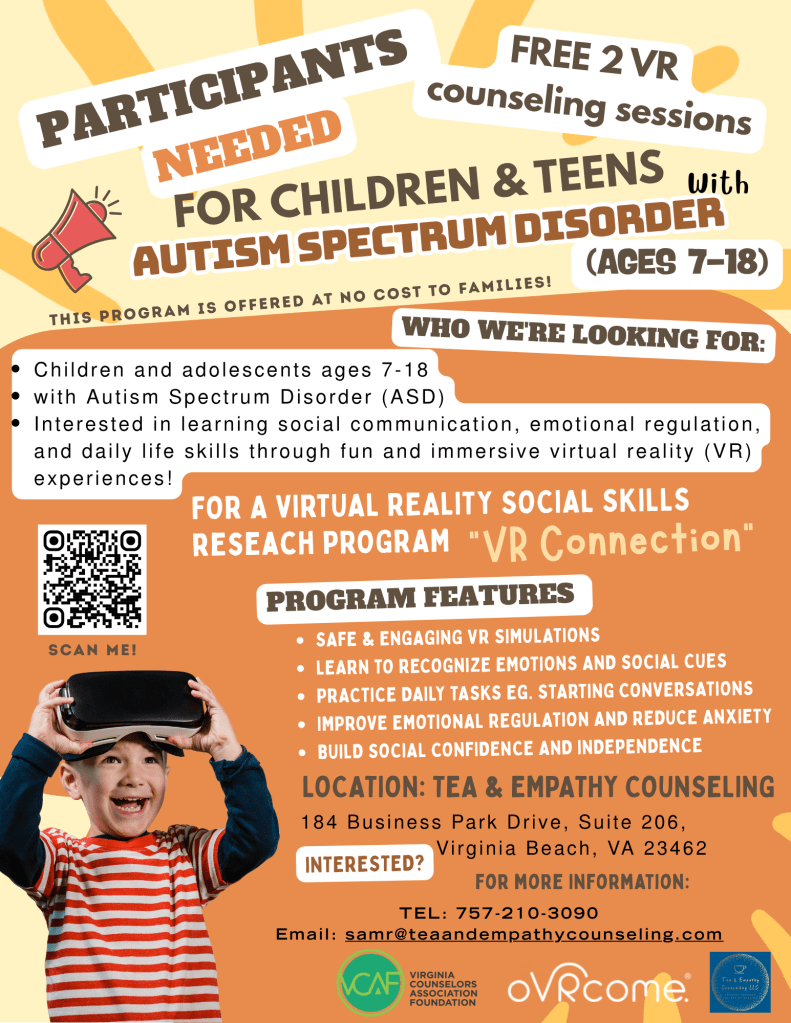 VR Connection is a research project I am conducting in partnership with Tea & Empathy Counseling, LLC, designed for children and adolescents (ages 7-18) with Autism Spectrum Disorder (ASD). In partnership with oVRcome and funded by the Virginia Counselors Association Foundation (VCAF), we use immersive Virtual Reality simulations to create a safe, engaging space for participants to practice and enhance social communication, emotional regulation, and daily living skills.